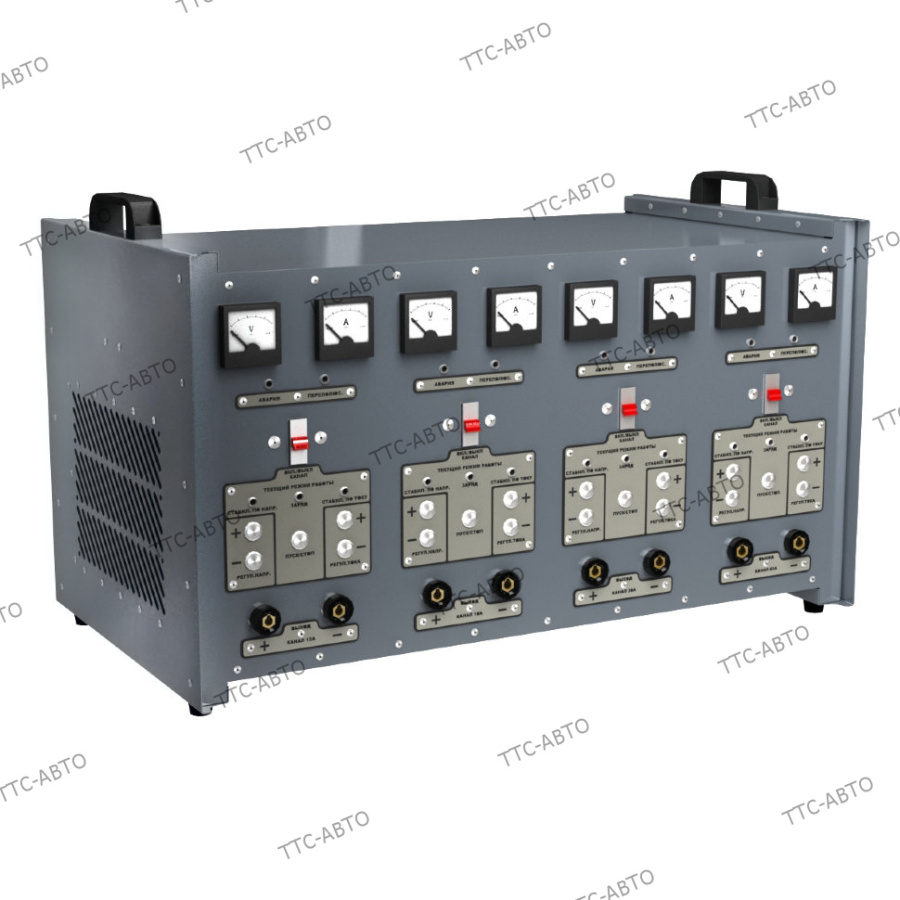 Устройство оснащено аналоговыми приборами для контроля напряжения и силы тока. Каждый канал имеет индивидуальные органы управления, что позволяет настраивать и работать с абсолютно разными АКБ одновременно.